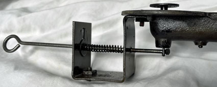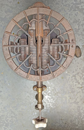 This Model 208C Heating Burner also appears in AGM Catalog 32. It could be mounted where needed; gasoline was supplied through copper tubing. The 6″ diameter burner (lower image) is preheated with the cup under the generator (upper image). The angled wire moves a door that regulates the air mixing with the fuel. This unfired Heating Burner is in James “Smitty” Smith’s collection.