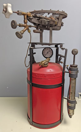 American Camp Stove No. 1, made by the American Gas Machine Co., Albert Lea, Minnesota, was advertised in Catalogue 22, circa 1917. “…’the furnace in a bucket’…produces an intensely hot flame… and is especially popular with the carnival and amusement trade for warming pits, for lunch stands, as a candy cooker, etc.” This model, in James “Smitty” Smith’s collection, weighs 15 lbs. and holds 1 gallon of gasoline.