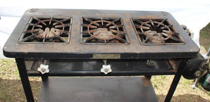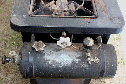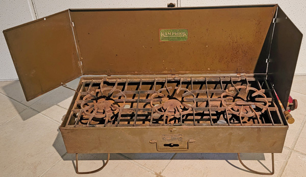 Kampkook Model 10 has three burners and a cast iron grates This stove is in Brien Page’s collection. As Model 6 above, Model 10 was in the 1923 AGM catalog, and required a separate pump.