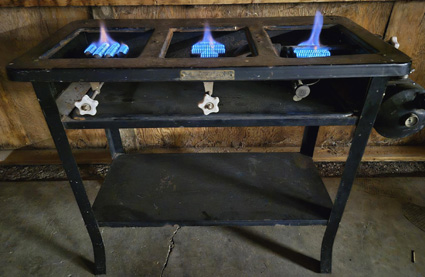 This upright Kitchen Kook 952-B range has the usual Kitchen Kook features including the electrically welded steel tank and removable grills. The burners are stated to seldom carbonize up and burn with a nice flame as can be seen in the 4th image. This Kitchen Kook is believed to be from the mid-1930s and is in Bill Klitzmanās collection. He stated that whilst the original drip tray and oven burner are both missing, the top two burners and the tank pressure gauge are all operating.