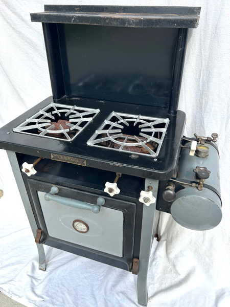 The Model 8 stove dates to the mid-1920s. It is distinguished by a built-on pump on the tank and an integral oven. Note the heat diffuser that sits on the cast iron grate. The cooking surface is 19 1/2″ x 10 1/2″. This stove is in Larry Hillhouse’s collection.