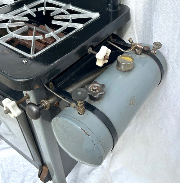 This Model 922 KitchenKook dates to 1930-31. Note that the burner on the left is positioned higher than the master burner on the right (upper image) since it can only be turned as high as the latter burner. Both burners are controlled by the valve at the back of the tank (lower image) while the white ceramic valves control the individual burners. The black fiber carburetor valve at the front of the tank is for instant lighting the main/right valve.The drip pan below the burners is pulled out to be more visible. This stove is in Mark Uidenich’s collection.