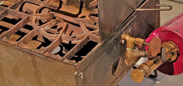 This Model 11 instant lighting stove appeared in Catalog 37 in 1932, two years after they introduced 3 instant lighting models: 77, 88, and 99. The black fiber angled valve to the left of the green letter “A” is opened for instant lighting with a fuel-air mix then the red fiber horizontal valve is opened below the letter “A” to supply only gas for running once the stove is lit. Once the stove is running, the black valve is closed. This stove is in Carlton Blanks’ collection.