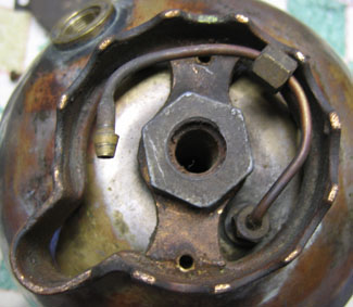 Another AGM No. 5 street lamp, this version has a shorter generator and a pressed, plated brass collar (left image) compared to the No. 5 street lamp above. The fuel line is soldered into the bottom of the valve that is threaded directly into the top of the fount (right image). This street lamp, in James “Smitty” Smith’s collection, was presumably made more recently.