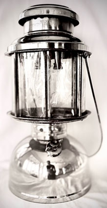 AGM introduced Model 337 in 1931. A low cost model, the metal below the globe cage was cadmium plated steel. Here the fount, which had rusted, has been buffed back to the steel. The mica globe pushes up inside the ventilator to preheat and light the single mantle. The paper label on the fount bottom (below) is often missing off the early AGM models. The L344 shade ring is a detachable option (above left). This lantern is in George Remkus’ collection.