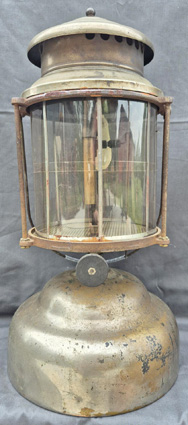 Models 277 (left) & 278 (right) only differ from Models 267 & 268 above in having built-on pumps. These two lanterns, in Bo Keller’s collection, came with straight AGM L35 generators, comparable to the Coleman Q77, and require preheating with a match. The globes are AGM with brass frames and large head fasteners as above. I have an ad from a 1926 magazine that pictures Model 278.