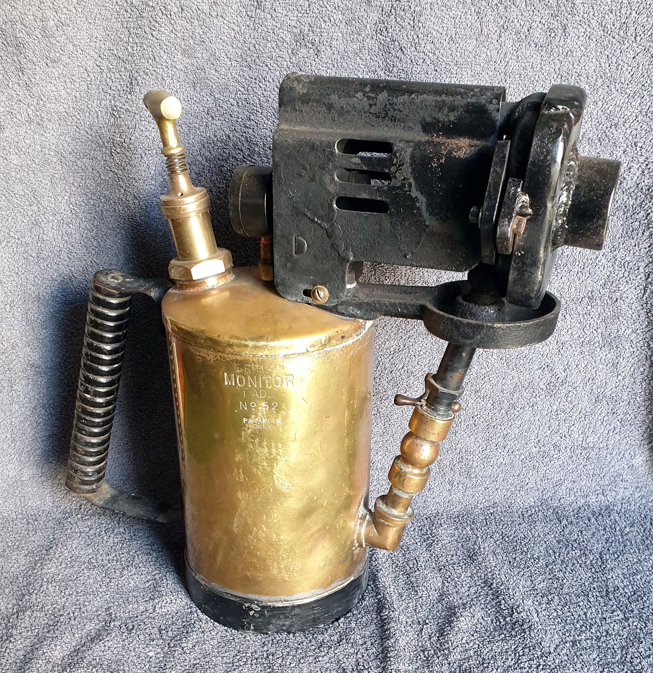 Notes: Monitor made several Super-Brazer models and this fundamentally top-heavy brazing lamp was made for many years. The unit is based on the Barthel patent. In 1934 an improved baffle plate was added. The coil was made from nickel chrome tube to resist wear. The control tap allows the unit to be turned off and the pressure retained. This unit from the Sedgman collection has a new pressure gauge and a refabricated front nozzle.
