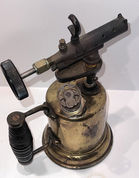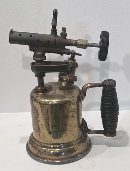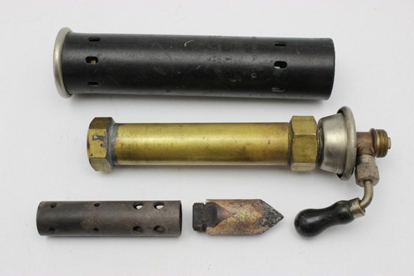 Notes: This blowtorch, formerly in Terry Marsh’s collection, was unusual in having no spirit cup. The user pressurised the tank, upended the torch and released a little fuel back onto a small part of the burner. Once lit the unit was heated until that fuel was exhausted and the valve then opened.