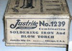 The Good Mfg Co was stamped on the Justrite model 1239 as the manufacturer and Justrite was stated to be a trade mark. However, Justrite Mfg Co, founded in 1906 was Chicago based and started out in carbide lamps as per their 1915 carbide lamps catalog. Justrite Mfg Co held the patent for the improved combination soldering iron / blowtorch model 1239. The Justrite company produces fuel cans and other safety products to this day.