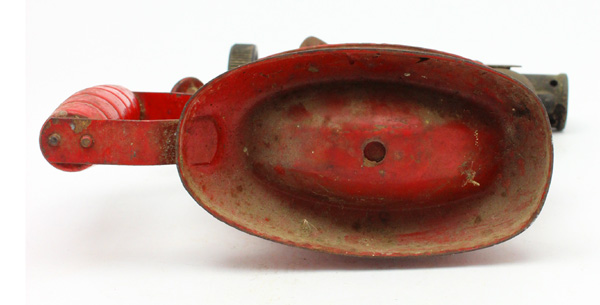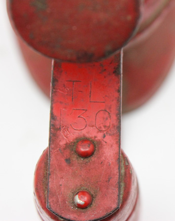 Notes: This bright red ‘auto-torch’ has an interesting shape and was based on the last and most common of 4 different versions of the model 0. This version has a filler plug and upright handle. Version 3 had a combined pump/filler plug and versions 1 and 2 had angled handles. The torch was formerly in Terry Marshs’s collection.