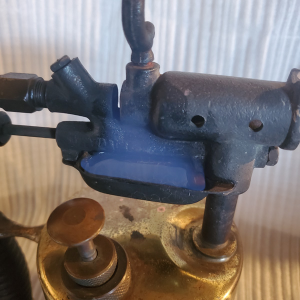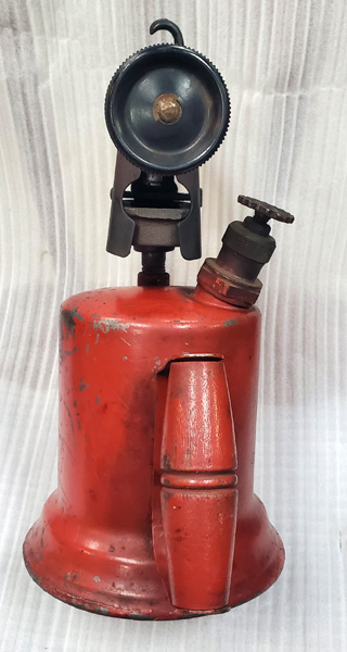 Notes: The Preway model S-45 was made by Prentiss Wabers Products Co of Wisconsin. Dean Dorholt, whose collection it is in, pre-heats it with alcohol and then runs it on Coleman Fuel. The S-45 has a seamless brass tank with a steel base along with a Bakelite valve wheel. The blowtorch also featured the Preway Instant Lighter, with it’s smaller Bakelite second valve wheel. The tank is a top fill model requiring the removal of the pump assembly and probably a funnel. A later version, the 45A, had a bottom fill plug.