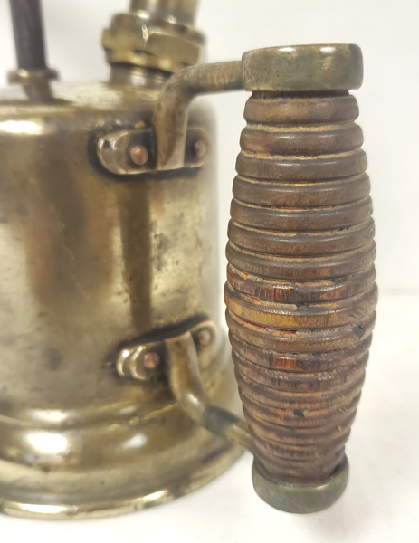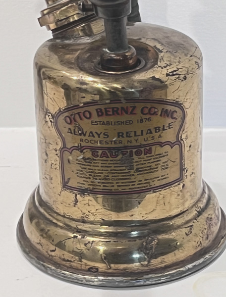 Notes: This is a little known blowtorch that has the earlier features of Otto Bernz blowtorches including the six pointed metal valve wheel and the ribbed wooden handle held by cast bronze fittings. The torch is in Dean Dorholt’s collection and is stamped Otto Bernz & Co. Newark N.J. with the Bernz ‘Always Reliable’ slogan. The inclined torch is bottom filled.