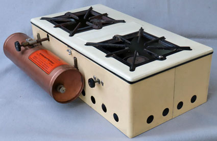 Coleman’s 2-burner camp stove, Model 419, was available only in the 1941 catalog. The control knob for the second burner retracts into the stove for transport. The bend in the grate wire makes room for the tip cleaner valve when the tank is stored in the stove. This stove is in John Stendahl’s collection.