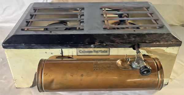 Coleman also made larger hot plates such as this Model 392. This nicer model sold for $13.95 in 1939. This stove, in John Stendahl’s collection, features a “Solodur metal fuel tank, hi-power wind-proof burners, and lights instantly.” The burners are cast iron.