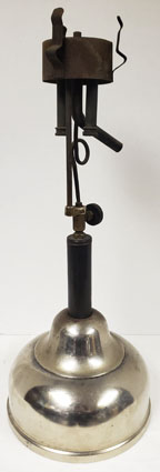This lamp resembles a Coleman Model DT lamp except that it lacks the stamping under the valve cover (bottom image), is match lighting, and is fitted with a “Z” burner (right image). The fiber valve wheel is only marked with the word CLOSE and an arrow. The fount and cover plate are steel (bottom image). The lamp may have been converted in the late teen years. The lamp is in Dean Dorholt’s collection.