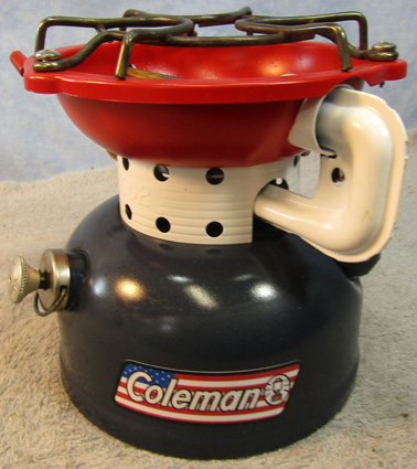 Bill Sheehy customized his Coleman No. 460G Handy Gas Plant with a new paint job, label, and varnished plywood base. The label (second image) includes his creative uses for the appliance. Bill was boiling eggs when the image was taken. The base has three concentric layers (third image). The top circle is covered by the appliance and includes the stenciled directions enlarged and painted on the wood as the original part is unreadable. The bottom two circles are lined up by two aluminum posts and held together by two magnets. When opened (fourth image) the wrenches needed for service are exposed.