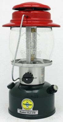 Steve Ream made his KerOSpec 237 by combining a 1958 mil-spec fount with the fuel system and collar from a Coleman 237A, a red re-enameled vent from a Queen Products Division one mantle lantern, and a Coleman for Sears Model 72217 lantern bail. Steve also used the wire cylinder from a Coleman 206 in the preheater cup and an amber globe on which he bead blasted a band to reduce glare.