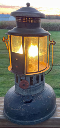 This lantern may have been made during the 1930s Depression. The lantern came from a long-time dairy farm and is now in Jeff Lietzke’s collection. The fount with integral pump and generator are from a Coleman lamp model of the period while the burner, valve assembly, and frame are from a Nulite lantern such as a Model 3 or 18, also of that period. The collar became taller in the process and was made from a length of stove pipe (lower image).