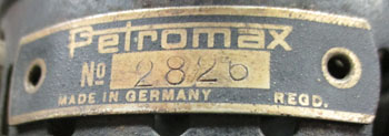 Petromax Model 828 is a 350 cp kerosene fueled lantern. The lantern, in George Burl’s collection, has an oval preheater valve (lower image) which dates it to 1936-39 (McRae). This lantern has 11 6 (November 1936) marked in the brass bottom.