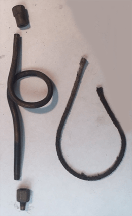 We have not found this unmarked Gloria table lamp in a catalog so Neil McRae designated it as Model “E”. It was found in Australia so may have been made there or imported by Gloria from the US where the company also made this model. This one has a match lighting generator (disassembled, right image) that is presented in a 1914 Gloria US catalog. The asbestos core would become plugged with carbon particles so the generator had to be replaced after three months of use. This lamp is in Anthony Trueman’s collection.
