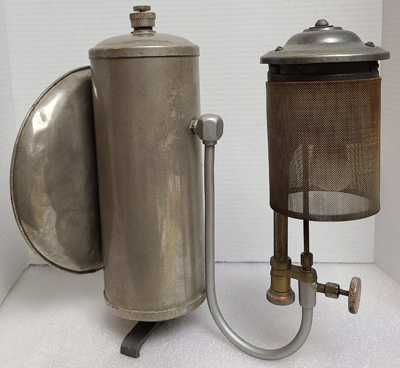 The Gloria Light Co. Pty. Ltd., Melbourne, Australia, made this Model 100 kerosene fueled lantern. The pump style is European but the valve assembly with tip cleaner are comparable to Coleman. There is a lower preheater cup that is part of the recessed baffle plate, which may have been too low to effectively preheat the Preston generator so another preheater cup that can pivot away from the generator base rests on the base of the air tube. The upper cup can be moved to access the bolt fastening the frame to the valve body. This lantern is in Tony Press’ collection.
