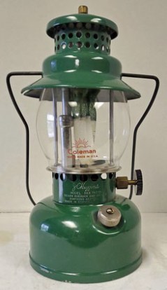 James Harvey found this lantern in Germany. It has no markings but closely resembles a Coleman models 242 and 242A from the early to mid-1930s. The ball nut, plated brass ventilator, bail, valve wheel and tip cleaner lever are all different from Coleman models.