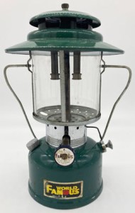 This lantern is only identified on the fount label as “World Famous” (upper image) and is marked Made in Hong Kong on the direction disk. The World Famous brand can be traced to a US distributor, American Recreation Group, Inc. (Neil McRae), who also identifies the lantern as Model 490. The lantern is very similar in design to a Coleman 228 series lantern but with a 1″ smaller diameter ventilator. This lantern is in Steve Upham’s collection.