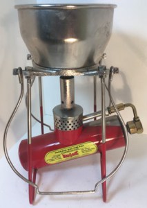 This is the Bernz Model TX500 stove. The stove, in Kevin Grant’s collection, is date stamped September, 1955 on the knob. The propane cylinder that came with the stove is date stamped October, 1955. The grate on this single burner model folds up to form a carrying handle as on the TX800 model stove below.