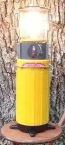 This Model 2160BFB American Camper lantern uses a single small mantle that is tied at the top and bottom of the burner. It also has electronic ignition, uses butane or propane canisters, and has retractable legs. The lantern fits down in the yellow case once the fuel canister is removed. This lantern is in Russ Slivinski’s collection.