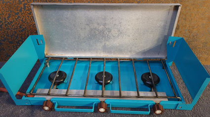 A two burner version of the above stove, Model LPA-10, also made by the Metalcraft Mfg. Corp., and in Brien Page’s collection. This stove has two LP canisters/burner and is hinged in the middle to fold up for carrying. The metal flaps fold down when he stove is operating.