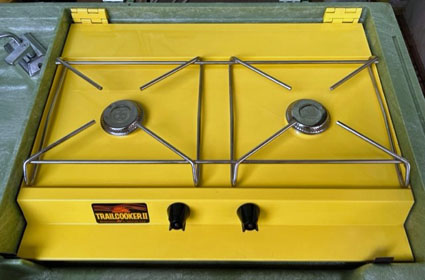 Humphrey Products, Kalamazoo, Michigan, made this CooKit two burner stove. The stove appears to date to the 50’s and uses a 20 lb propane cylinder. Brien Page, whose collection this is in, reports that the burners are large and produce a lot of heat.