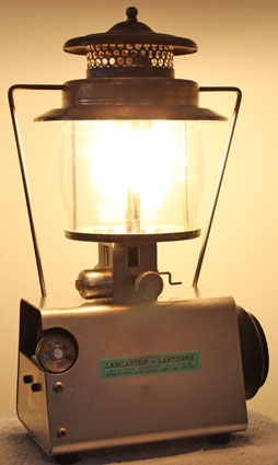 Lancaster Lanterns made this two mantle, 500 cp propane lantern, Model 902s. The base is aluminum while the ventilator is stainless steel. The primary market for this company is the Amish. Since it consumes a 16.2 oz container of propane in 2 hours, they also sold an adapter to refill the 1 lb container from a 20 lb cylinder.