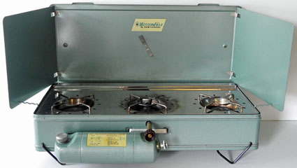Another Western Field stove model for Montgomery Ward made by Rinnai, this Model 60-9514 has three burners. It also has two unusual features: 1. a removable wire grate above each burner and 2. a curved reflector between the rim of the burner and the top of the case (lower image). The reflectors concentrate the heat on the object being heated, according to Sean Fahey, whose collection this is in.