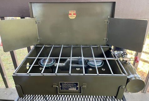 This Ozark Chef branded 4 burner stove may have been made in an Asian country. The manufacturer is unknown but it was marketed by McGraw-Edison, that also made a combination lantern-stove (McRae). The front left burner is lit first, then the other burners (lower image). A panel (not shown) covers the front of the top when the stove is closed. This stove is in Patrick Fisher’s collection.