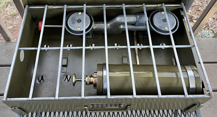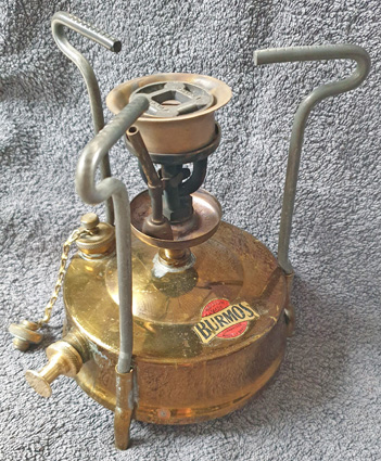 This British military stove was manufactured by Townson & Coxson in 1944 (lower image). This paraffin (kerosene) burning stove fits in the container to the left in the upper image that doesn’t function as a pot. The flat tin embossed Spares holds repair parts. This stove is in Reese Williams’ collection.