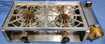 Model 42A Senior stove was also made by the Wehrle Co. Mike Bullis had to repair the tank in a couple of places before he was able to operate it; the stove is now in Harold Porter’s collection. The controls for the right (master) burner are on the tank. The tank is pressurized with a separate pump. The stove frame is cast iron.