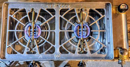 This Sea Cook stove model was made by the Wilcox Crittenden Co., Middletown, Connecticut. It is alcohol fueled (lower image), a safety feature in marine stoves. As on other marine stoves this one has a rim above the cooking surface to help hold cooking vessels in place. This stove is in Mark Burnett’s collection.