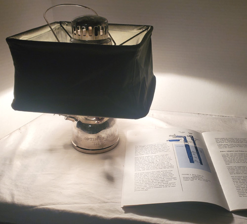Optimus Model 930 was introduced around 1954. This lantern, which is in Dean Dorholt’s collection, came with the Swedish military green shade that has their three crowns imprint they used to mark their equipment (lower image). In spite of the dark shadows created by the shade, it illuminates documents that are placed beyond the shadows (upper image).