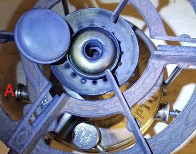 This Optimus No. 5 was made a few years after the No. 1 stove above but shares some of the same features including the cast iron grate and the external NRV pump (“A”, lower image). The inner cap of the silent burner is a replacement. Note the top of the outer cap of the silent burner is removable. This stove is in Jeff Studer’s collection.