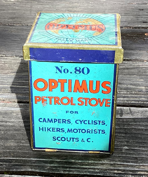 This Optimus model 80 brass stove was advertised for camping over many years. Coming with a burner crown and burner plate similar to a SVEA 123, the stove held a ¼ litre of fuel and was able to boil a litre of water in 7 to 8 minutes. This stove is from Duane Hall’s collection and is unfired.