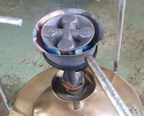 This very early Primus No. 1 brass stove dates to 1895/96 and carries a retailer’s badge for Chambers & Seymour, ironmongers of Melbourne. This stove, made by B.A. Hjorth & Co., had a roarer burner and a removable pump tube with an NRV accessed from the outside via a large nut (top image). The small cork sealing washer can be seen with the tensioning spring in the lower image. The stove is from the Sedgman collection and has an old repair visible on the air screw riser. The filler cap is period correct. The stove burns with a nice blue flame (middle image).