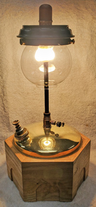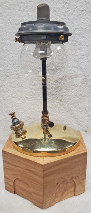 Tilley made their ML98 Oak Stand Lamp from 1935-40 (J. Dick). In the first four years it was made with decorative indentations in the polished oak hexagon stand. Dean Dorholt found the lamp without the stand or shade. He buffed out the damaged lacquered finish on the brass fount. Anthony Trueman reproduced the stand with six, rather than three, pieces of oak as original.
