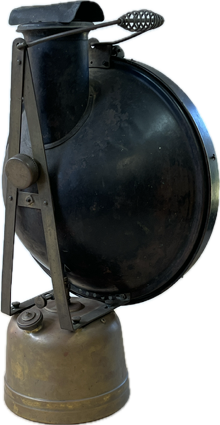 The Model AL 11 dates from 1935 to 1937 and was designed as a rail road inspection lamp. They have a 250 cp burner and give a reflected cp of 1500 or more. This one was given to Neil McRae by a gentleman that had been using it as a headlight on a canal narrow boat.