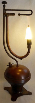 These lamps may also have been manufactured by Tures. The lamp on the left is in Jon Schedler’s collection. The mica chimney appears to be original to the lamp. The metal hemisphere at the right end of the generator is adjustable to regulate the amount of air. The lamp in the center and right images is in Conny Carlsson’s collection. The upright mantle (right image) is suspended from a forked metal rod that attaches to the burner. Note the bleeder screw on the bottom of the mixing tube at the low point. Draining condensed fuel by opening the screw before lighting the lamp insures that it will run well.