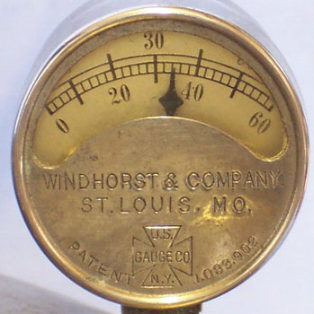 This Windhorst lamp is also marked on the pressure gauge as the donut lamp above. Conny Carlsson, whose collection this is in,discovered that this lamp has the same burner (lower image) as the burners on a lamp model possibly made for the Sun Gas Lamp Co., Kansas City, Missouri, a company for which we can find no records, only a couple of advertisements.