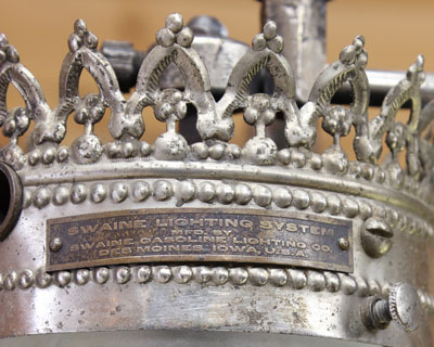 The burner head on this lamp is badged (middle image): Swain Lighting System, Mfd. By, Swaine Gasoline Lighting Co., Des Moines, Iowa, U.S.A. The Swaine company was in business for only four years, 1910-14, and primarily sold hollow wire or system lighting and portable lamps, whose parts were made by other manufacturers. This lamp, in Rob Butts’ collection, may have been made by the Swaine Gasoline Lighting Co., or assembled by someone else from a hollow wire fixture and parts from other companies.