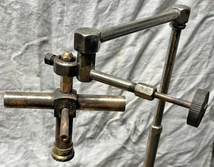 This unlabeled lamp was advertised by the Sun Gas Lamp Co., Kansas City, Missouri, as their Home Reading Lamp No. 1 and their No. 1 General Utility Lamp. The No. 1 lamp above, in Dwayne Hanson’s collection, has a fuel-air tube that rotates just below the right valve wheel (lower image) to allow access to the mantle, globe, and burner parts. This model was rated at 550 CP.