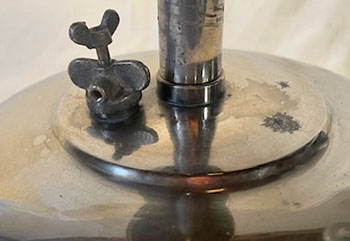 This lamp appears to be an earlier model made by Pitner based on the similarities of the burner and other parts. This 21″ tall lamp, in Doug Dwyer’s collection, has no preheating cup and a vertical air tube. The burner gratings are similar to the above lamp but are easily bent. The pump that this lamp came with can be seen here.