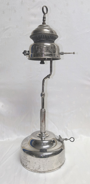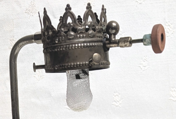 This lamp has no markings, and we don’t know who made it. The lamp lacks a shade, a burner tube and burner cap (3rd image from top), and likely had a cap on the Schrader valve (bottom image). The lamp has a number of unusual parts suggestive of the early 1920s including a donut-shaped mixing chamber casting that surrounds the generator. The lamp appears to be match lighting. Loren Abernathy, whose collection this lamp is in, bought it in an online auction from Chambersburg, Pennsylvania, in 2003. Please contact us if you think you can identify the manufacturer of this lamp.