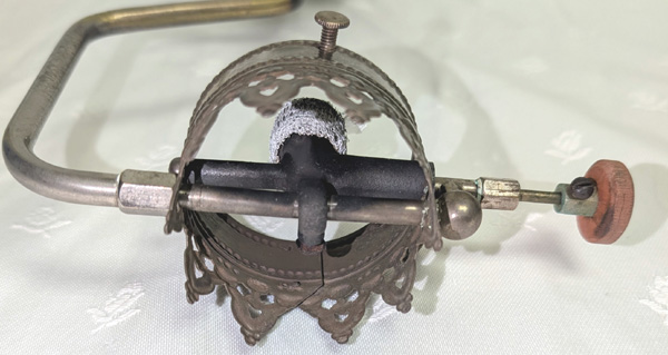 The fuel passes through the end with the “U-shaped” casting and back across in upper horizontal tube carrying a fuel-air mix that came from the orifice in the lower tube. The upper tube ends in the casting that also helps support the two horizontal tubes. The casting carries the fuel-air mix to the burner tube and then to the mantle. The purpose of the small metal bracket (ring) about 4” below the burner cover is not known.